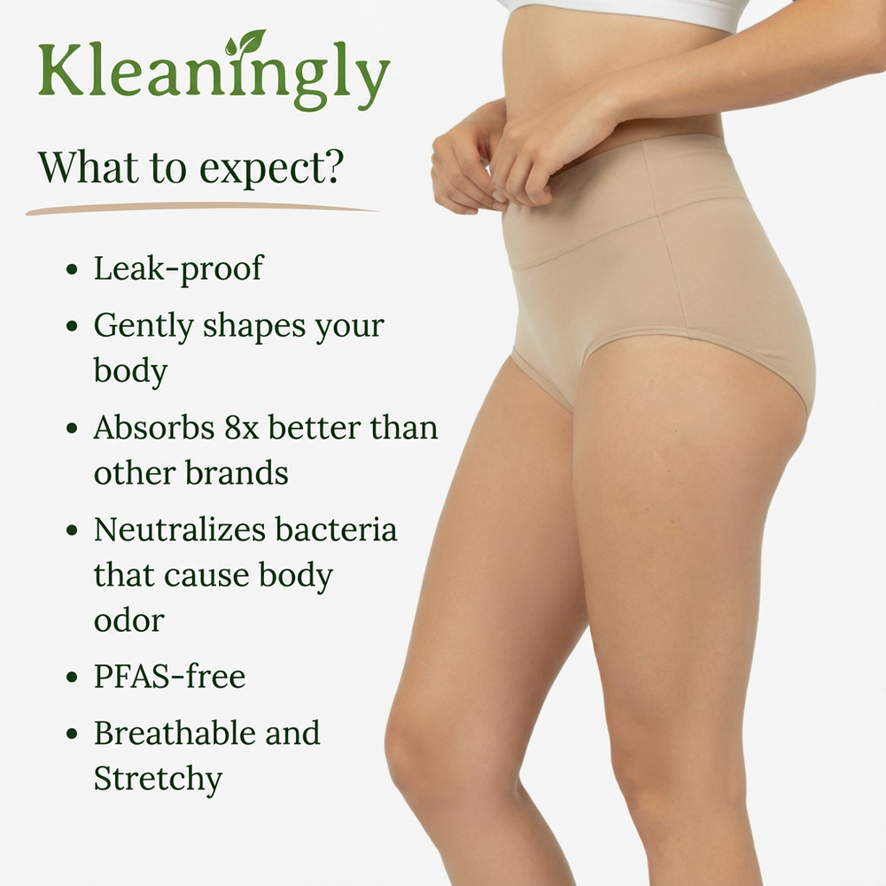 Just wear Kleaningly like your regular underwear—no added steps or worries. The seamless, stretchy waistband fits snugly at your hips, while targeted compression supports the pelvic floor. Machine washable and quick drying, it's designed for daily, hassle-free use. Full care instructions included for long-lasting performance.